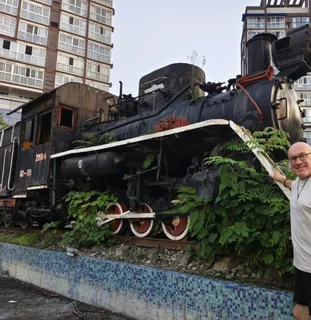 這裡我站在一台曾經行駛於四川彭州至白水河路段的600毫米窄軌蒸汽機車旁,該機車屬於ZM16-4型,如今在天府作為展示用的紀念機車,過著頗為淒涼的日子。