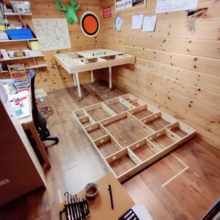 我使用堅固的多層板製作了兩個經過精密裁切的框架模塊,作為整座模型鐵道的基礎結構。
