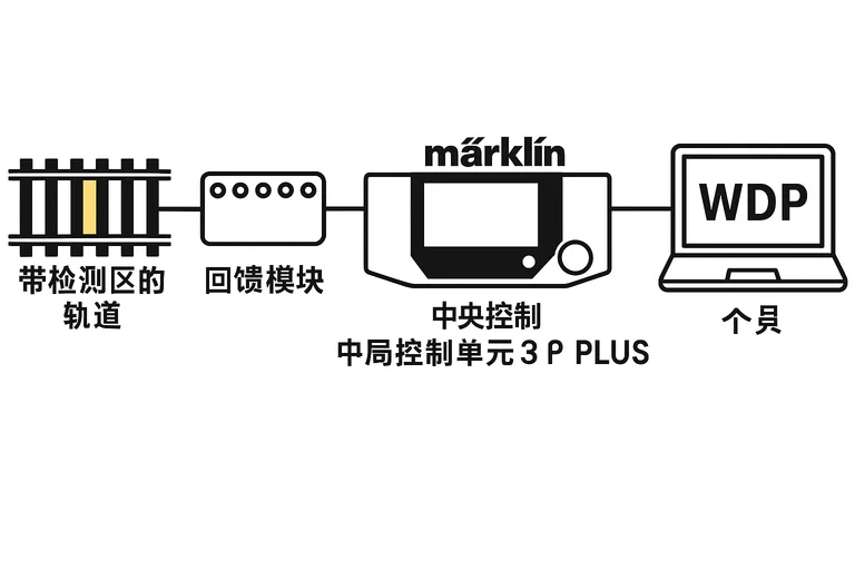 基本條件很簡單:您的機車已經數位化並配有解碼器;您擁有一台數位控制中心(例如 Märklin CS3+);以及一台安裝了 WDP 軟體的電腦。若要讓控制中心與程式自動駕駛列車,必須先對軌道進行準備,使軟體能隨時「知道」每台列車的位置。